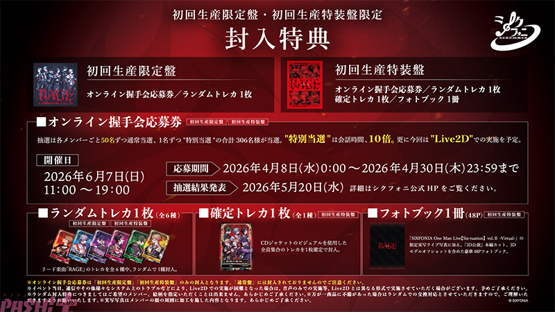 フォトブックには、「SIXFONIA One Man Live【Six-tuation】vol.II -Virtual-」の限定実写ライブ写真に加え、3D公演の本編カットやオフショットを収録。シクフォニとして初めて実写写真を含む構成となっており、ステージとは異なるメンバーの新たな一面を楽しめる内容となっています(実写写真は顔周辺に加工を施した仕様です)。
