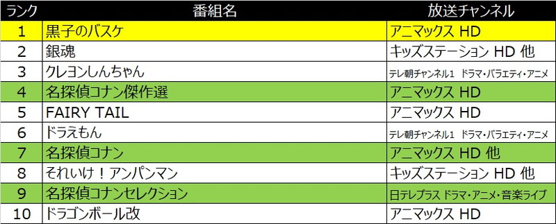 アニメジャンル(海外、国内含む)は、夏休み=小さな子どもが好きなアニメと連想されそうだが、少年漫画が原作にも関わらず、ハマる女子が多いことでおなじみの『黒子のバスケ』が1位を獲得。さらに、時事問題や世相を反映したストーリー展開で、子どもだけでなく大人が見ても楽しめると話題の『名探偵コナン』シリーズが3編成でランクインしたことを考えると、映画だけでなくアニメも大人を取り込んだ作品が強いことがわかる。