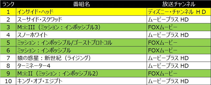 また、夏休み期間中に最新作公開となった『ミッション:インポッシブル』シリーズが4作品ランクイン。さらに『スノーホワイト』、『猿の惑星:新世紀(ライジング)』、『キング・オブ・エジプト』など、家族そろって楽しめる作品がランクインしており、映画の公開同様、夏休みは“子どもだけ”、“大人だけ”でなく、幅広くファミリー層を取り込んだ作品が上位を占める傾向にある。