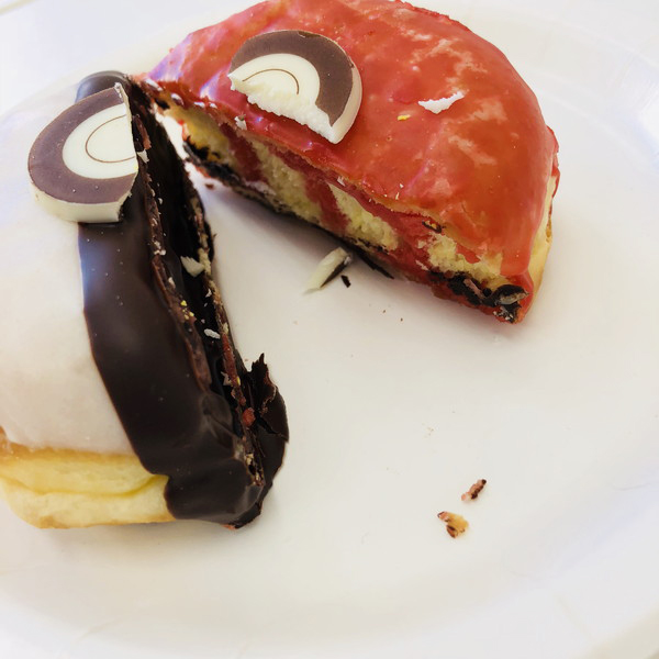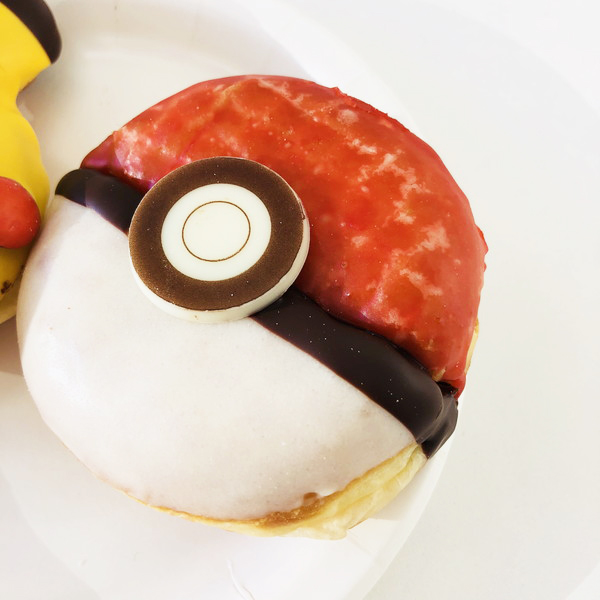 イーブイの紙トレイに入ったモンスターボールドーナツは、ふんわりとした食感の生地の半分がストロベリー風味のグレーズで、 もう半分はホワイトチョコをコーティングしてモンスターボールを表現しています! 開閉スイッチはチョコレート!!