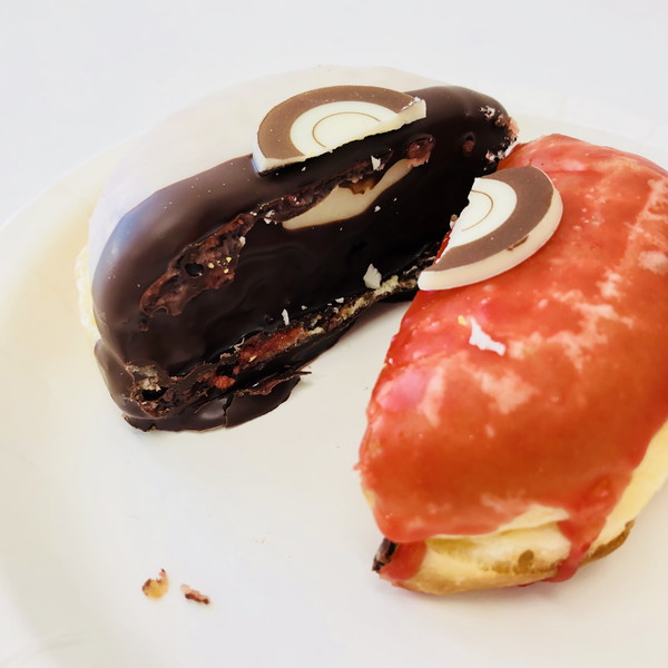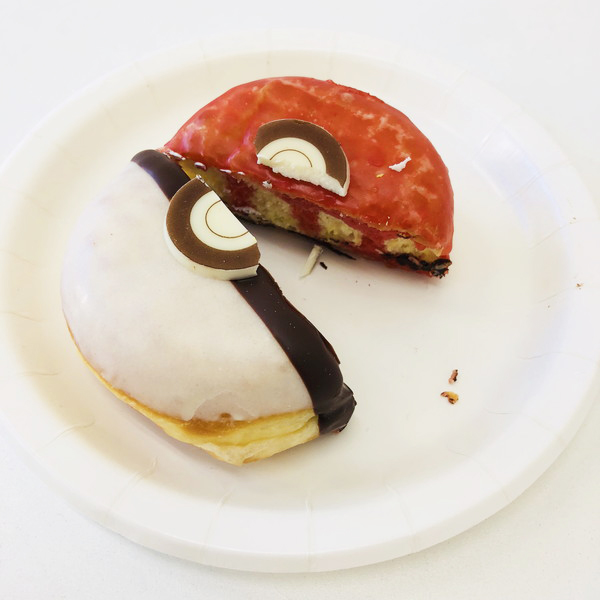 ぴったり真ん中でコーティングしている素材がわかれているので、一度に二つの味を楽しめるドーナツとなっています!