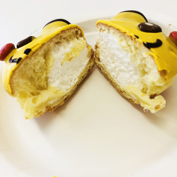 ふんわりとした食感の生地が、 バナナ風味のチョコでコーティングされています。耳の部分はチョコレートで、 くりくりのお目目やほっぺはチョコレートで表現! 生地の中はエンゼルクリームと同じものになっています♪