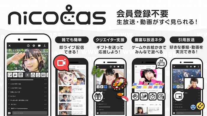 『nicocas』は、ニコニコ生放送のためのライブ配信・視聴アプリ。視聴者が生放送番組にアイテムを贈ることで番組を盛り上げたり配信者を支援することができる“ギフト”や、配信者がスマートフォンをサブカメラとして利用できる“マルチカメラ”などの機能を利用することで、配信者と視聴者が一体となって番組を盛り上げることができる。