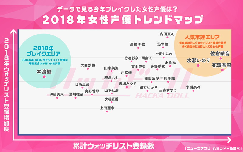 ウォッチリストに登録された女性声優上位30名の登録件数の増加度から、2018年のトレンド傾向が分析されている。