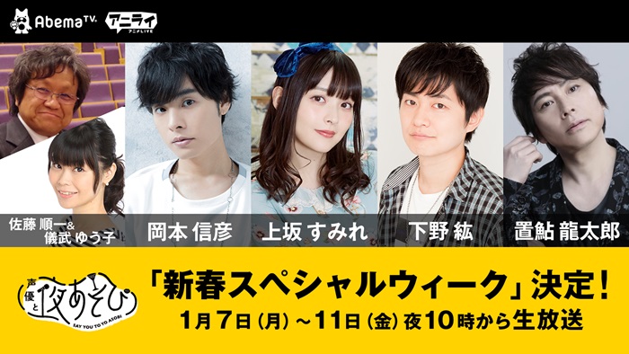 “AbemaTV”は、深夜アニメ作品に加えて声優生放送レギュラー番組やアニソンLIVEまで見られる“アニメ LIVE チャンネル”にて、2019年1月7日(月)から1月11日(金)にかけて“声優と夜あそび”の特別企画“新春スペシャルウィーク”を実施する。