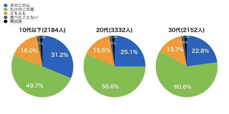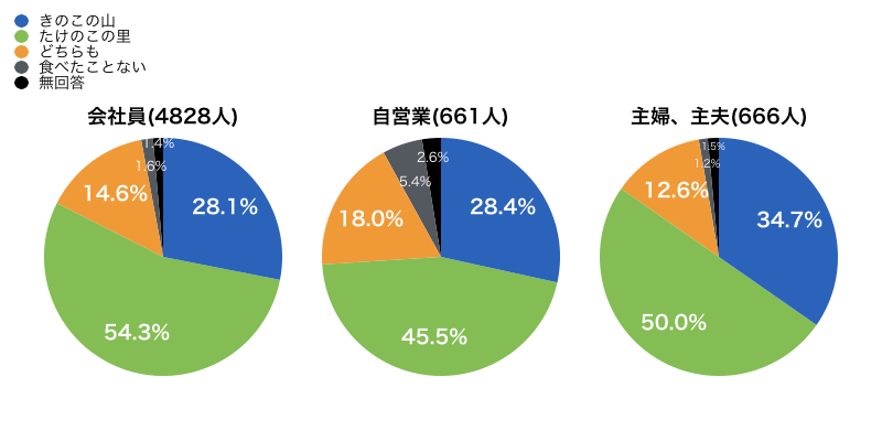 やや特徴的なのが、主婦、主夫層がどちらもが少なくきのこの山かたけのこの里かを白黒はっきり示している点。ただし、いずれの属性においても大きな差は見られないことから、社会人や学生などの立場による派閥は存在しないと考えられるため安心して食べてよさそう。