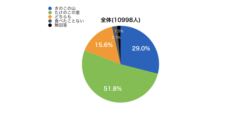たけのこの里が、きのこの山に対し約1.8倍の差をつける結果に。また「食べたことがない」は2.1%に留まり、一般に広く認知された菓子であることが分かった。