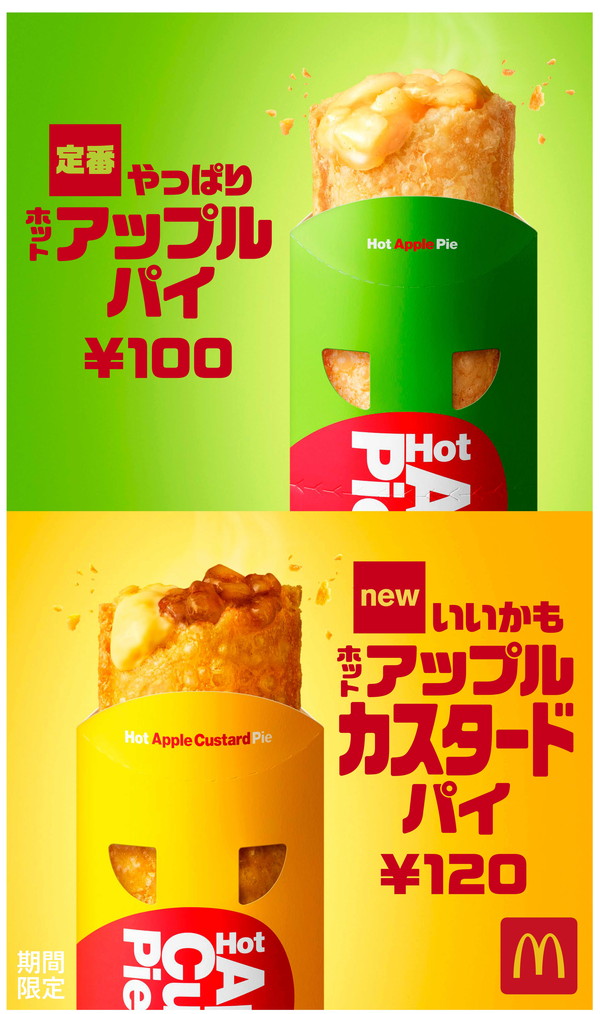 日本マクドナルド創業当初から販売されている商品で、今でもなお不動の人気を誇る定番商品“ホットアップルパイ”と、今回期間限定で新登場する“ホットアップルカスタードパイ”の両方を試せるのは“今だけ”! 小腹が空いた時のスナックや 食後のデザートとしてはもちろん、冷えた体を温め、ほっと一息つきたいときなどに、“今だけ”味わえる“ホットアップルカスタードパイ”を120円(税込)という手頃な価格で楽しもう♪