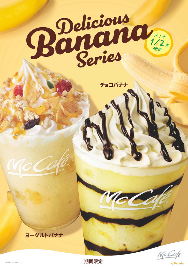マクドナルドの専任バリスタによる本格カフェコーナー“McCafé by Barista”併設店舗にて、4月3日よりヨーグルトバナナ フラッペ、チョコバナナフラッペ、バナナアイスラテ、バナナホットラテが期間限定で販売される。