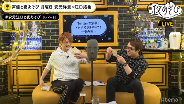 “無料で楽しめるインターネットテレビ局”「AbemaTV(アベマティーヴィー)」は、「アニメLIVEチャンネル」において、2019年4月15日(月)の夜10時から夜11時30分にわたり、『声優と夜あそび【月:安元洋貴×江口拓也】 #2』を放送いたしました。本放送では、MCの江口拓也さんが番組のLINEスタンプを考えたり、視聴者からTwitterで寄せられた「イケボで囁いてほしい言葉」をダミーヘッドマイクで話したりと、さまざまなコーナーを行いました。