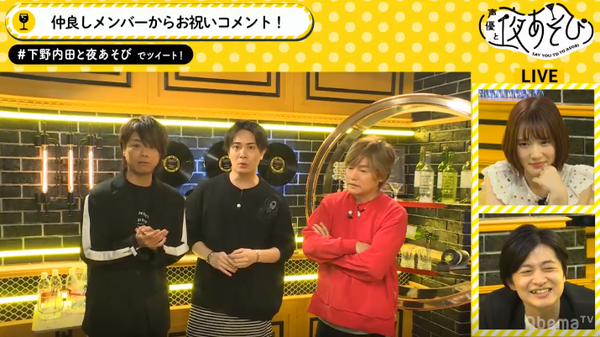 放送では、ほかにも下野紘さんが主演する『クロノス・ジョウンターの伝説』のPR時間をかけた“下野紘クイズ”や、浪川大輔さん(木曜日MC)、森久保祥太郎さん(木曜日マンスリーMC)、鈴木達央さん(『声優と夜あそび 木曜日』#1のゲスト)からのお祝いビデオメッセージの公開、大人気コーナー“シモザップ”では内田真礼さんの体組成をチェックするなど、まさに下野紘づくしの90分をお送りしました。