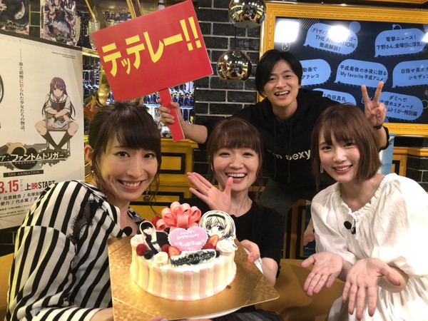 その後、4 月24 日に誕生日を迎えた名塚さんへ、金曜日MC の関智一さんからサプライズのビデオメッセージが届けられ、番組特製のケーキで誕生日をお祝いしました。また放送では他にも、即興でシーンを作る「ダミヘで穴埋めエチュード ファントムトリガー特別編」や「目指せビボディ!シモザップ」のエクササイズ(シモササイズ)編など、さまざまな企画に挑戦。ゲストの2 人は最後まで番組を楽んでゆきました。