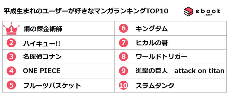 2017年に実写映画化も話題になった『鋼の錬金術師』が1位を獲得。平成2年に連載を開始した作品もランクインしており、アニメや映画化などをきっかけに平成生まれのユーザーに認知されたことがわかりる。令和生まれのユーザーは、どんな平成マンガに注目するのか楽しみだ。