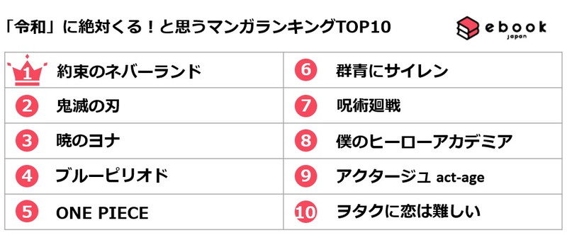 イーブックジャパンより、平成生まれのユーザーにアンケートが実施され、“令和”に絶対くる! と思うマンガについての調査結果が発表された。