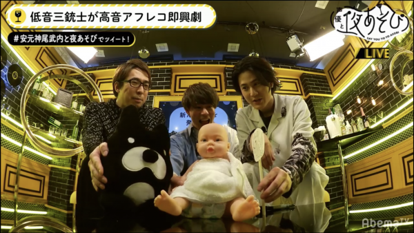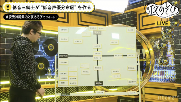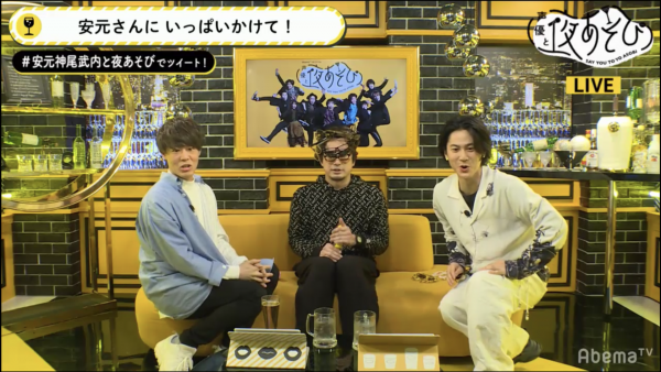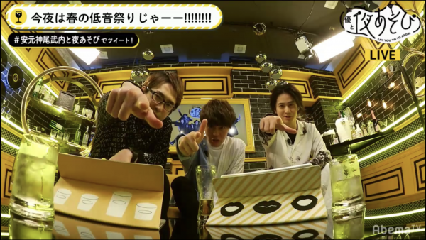“無料で楽しめるインターネットテレビ局”「AbemaTV(アベマティーヴィー)」は、「アニメ LIVE チャンネル」において、2019 年 4 月 29 日(月)の夜 10 時から夜 11 時 30 分にわたり、『声優と夜 あそび【月:安元洋貴×神尾晋一郎×武内駿輔】 #4』を放送いたしました。本放送では月曜日 MC の江口拓也さんがお休み、神尾晋一郎さんと武内駿輔さんがゲストに登場し、安元洋貴と低音声優 の分布図作成や、低音ボイスでツイートに上がった面白い単語をささやくなど、さまざまなコーナ ーに挑戦いたしました。