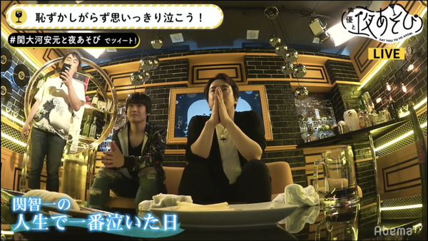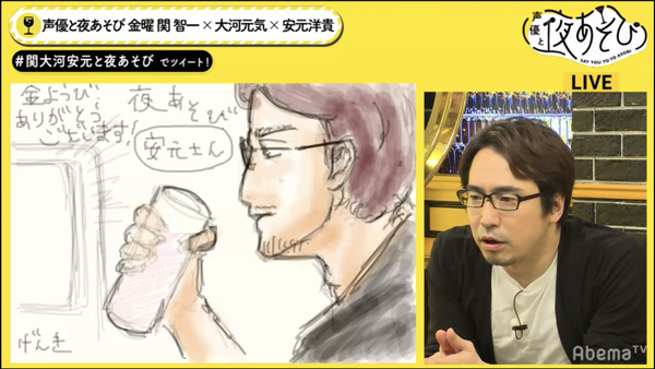 “無料で楽しめるインターネットテレビ局”「AbemaTV(アベマティーヴィー)」は、「アニメLIVEチャンネル」において、2019年5月3日(金・祝)の夜10時から夜11時30分にわたり、『声優と夜あそび【金:関智一×大河元気】 #4』を放送いたしました。本放送ではMC2人と、「AbemaTV」開局3周年スペシャルウィーク企画として毎日登場中の月曜日MCの安元洋貴さんがゲストに登場し、5連勤の安元さんを労うコーナーや、ぶっちゃけ討論会などを行いました。