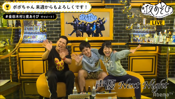 “無料で楽しめるインターネットテレビ局”「AbemaTV(アベマティーヴィー)」は、「アニメLIVEチャンネル」において、2019 年5 月7 日(火)の夜10 時から夜11 時30 分にわたり、『声優と夜あそび【火:金田朋子×木村昴】 #6』を放送いたしました。本放送ではMC の2 人が、金田さんのご主人である森渉さんも交えて“架空の商品のCM 作り”に挑戦しました。