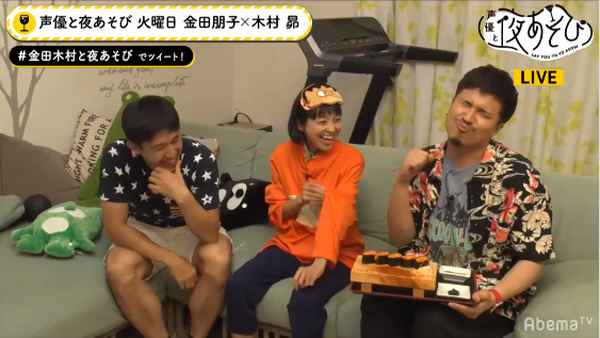 “無料で楽しめるインターネットテレビ局”「AbemaTV(アベマティーヴィー)」は、「アニメLIVEチャンネル」において、2019 年5 月7 日(火)の夜10 時から夜11 時30 分にわたり、『声優と夜あそび【火:金田朋子×木村昴】 #6』を放送いたしました。本放送ではMC の2 人が、金田さんのご主人である森渉さんも交えて“架空の商品のCM 作り”に挑戦しました。