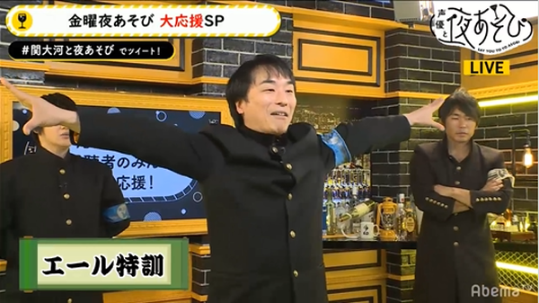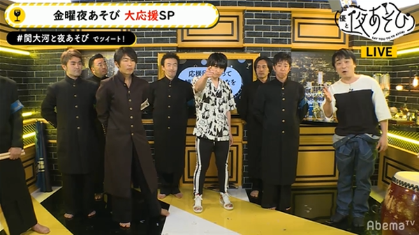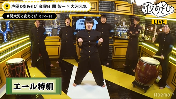 “無料で楽しめるインターネットテレビ局”「AbemaTV(アベマティーヴィー)」は、「アニメLIVEチャンネル」において、2019 年5 月31 日(金)の夜10 時から夜11 時30 分にわたり、『声優と夜あそび【金:関智一×大河元気】#8』を放送いたしました。本放送ではMC の関智一さんと大河元気さんが応援団に扮し、青空応援団の指導のもとエールの特訓を行なったり、視聴者から寄せられた悩みに対してエールを返したり、津田健次郎さんのサプライズ生電話があったりと、さまざまなコーナーを行いました。