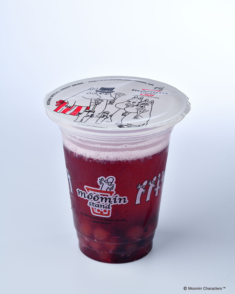 ムーミンスタンドでは定番人気のミックスベリーソースが、夏にぴったりのさわやかなしゅわしゅわパチパチの炭酸になって新登場。甘酸っぱいベリー味の“ニョロニョロのたね” で、より色濃くベリーの風味を感じられる。