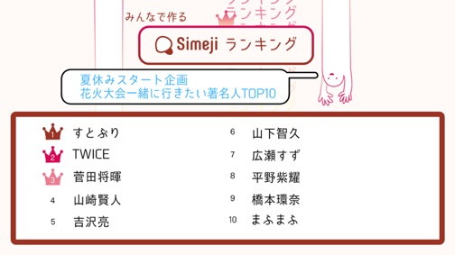 日本語入力&きせかえ顔文字キーボードアプリ『Simeji』より、10代女子の『Simeji』ユーザーへアプリ上で実施された“花火大会 ⼀緒に行きたい著名人”アンケート調査の結果が発表された。