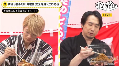 8月12日の夜10時から夜11時30分にわたり、『声優と夜あそび【月:安元洋貴×江口拓也】 #18』が放送されました。“声優と夜あそび 浴衣ウィーク”の初日とな る本放送では、MCの安元さんと江口さんの2人が浴衣姿でスタジオに登場。“縁日で夏を満喫しましょう”と題した特別コーナーで、綿あめ作りや風船釣り、射的などを楽しみました。