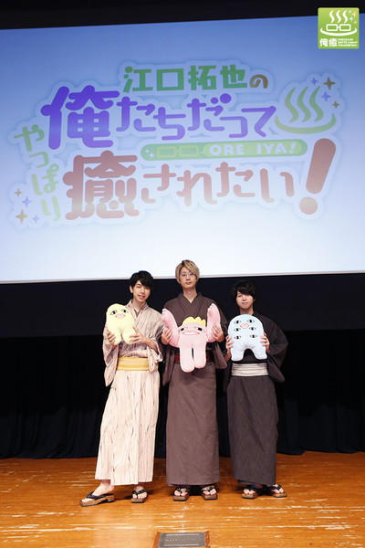2019年1月から3月までTOKYO MXで放送された『江口拓也の俺たちだってやっぱり癒されたい!』。声優の江口拓也さんがアシスタントの西山宏太朗さんとともに、ゲストを招いて癒しの旅をする番組『俺癒』第4期のDVDリリース記念イベントが8月18日(日)に千葉市民会館で開催。江口さん、西山さん、番組ではナレーションを担当していた斉藤壮馬さんの3人が登壇しトークを展開、会場を盛り上げていました。