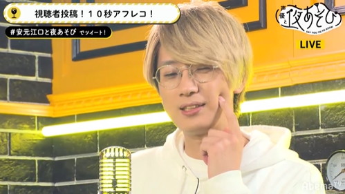 “アニメ LIVE チャンネル”において、9月2日の夜10時から夜11時30分にわたり、『声優と夜あそび【月:安元洋貴×江口拓也】 #21』が放送されました。本放送では新コーナー“視聴者投稿! 10秒アフレコ!で MCの2人が即興アテレコに挑戦したほか、月曜日の恒例コーナー“視聴者の心を読め! 夜あそびダービー!”や“味深ワード”、“しっぽりマンデートーク”などが行われました。