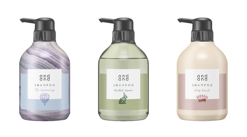 “and and(アンドアンド)”は、感性科学に基づいて開発された香りとデザインによる3種のシャンプー【気ままに(ティーハーモニーの香り)・静かに(ハーバルグリーンの香り)・ゆったりと(エアリーピーチの香り)】と3種のトリートメント【はしゃぐ(ヴィヴィッドフルーツの香り)・思いたつ(スパイシームスクの香り)・ときめく(スィートジャスミンの香り)】を、気分で、香りで、デザインで全9種類の組み合わせの中からセルフコーディネートを楽しむことのできる新しいコンセプトのヘアケアブランド。