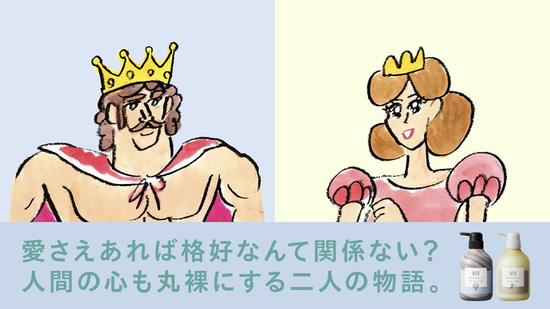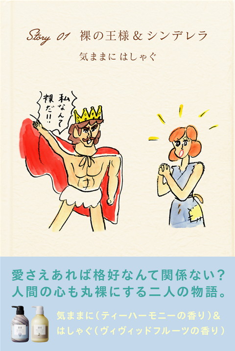 3種類のシャンプーをそれぞれ香りのコンセプトに近い童話のヒーローである“裸の王様”・“わらしべ長者”・“桃太郎”に、トリートメントをヒロインである“シンデレラ”・“鶴の恩返し”・“かぐや姫”に置き換え、ヒーローを梶裕貴さん、ヒロインを竹達彩奈さんという豪華声優陣が演じる本格派の朗読ムービー。愛嬌のあるイラストに声優陣の声がのり、そのギャップが観れば観るほどクセになる!