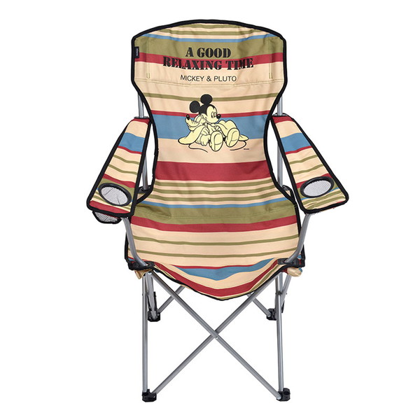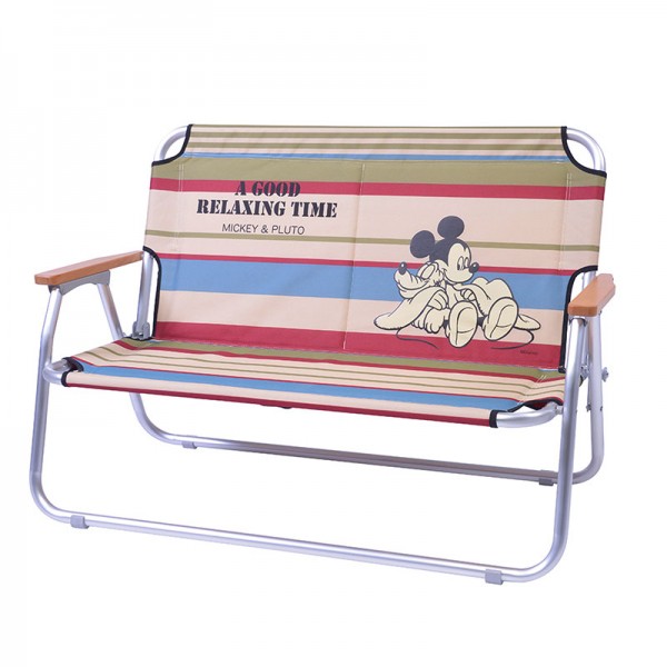 ミッキー&プルートデザインのマルチストライプ柄ベンチ。アルミフレームの2人掛けベンチ。おしゃれなストライプデザインに温かみのある木製の肘掛けがマッチ。パッド入りの背もたれと座面のおかげで長時間座っていても疲れにくいです。折りたためるので使わないときは省スペースで収納可能。たたんだ状態でも持ち運びしやすいように背面にハンドルが付いています。お家で手軽にアウトドアを楽しむベランダグランピング(ベランピング)や、本格的なキャンプ、ピクニックなど、様々なシーンで重宝するアウトドアアイテムです。