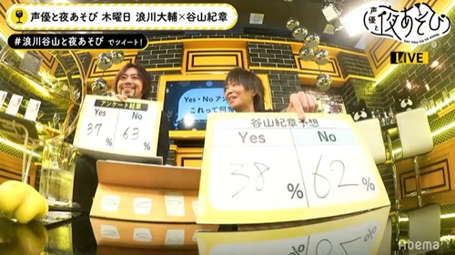 “無料で楽しめるインターネットテレビ局”AbemaTV(アベマティーヴィー)では、『アニメ LIVE チャンネル』において、10月24日の夜10時から夜11時30分にわたり、『声優と夜あそび【木:浪川大輔×谷山紀章】#28』が放送されました。本放送では視聴者アンケートの割合を予測する “Yes・No アンケート これって何%?”や、iPad 用のアプリで遊ぶ“オススメ!iPad 神アプリ”、懐かしの有名人の名前を思い出す“顔はわかるのに…あの人だれだっけ?”など、さまざまなコーナーが行われました。