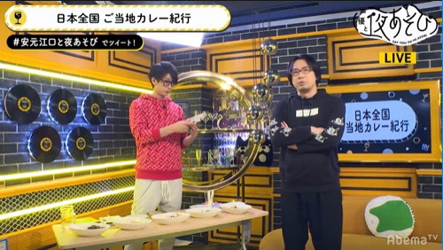 『アニメ LIVE チャンネル』において、11月4日の夜10時から夜11時30分にわたり、『声優と夜あそび【月:安元洋貴×江口拓也】 #30』が放送されました。本放送では月曜の定番コーナー“世界のことわざあるなしクイズ”や、先週から始まった“大人ビデオ”をつくろう、レトルトカレーを食べ比べる“日本全国ご当地カレー紀行”などのコーナーが行われました。