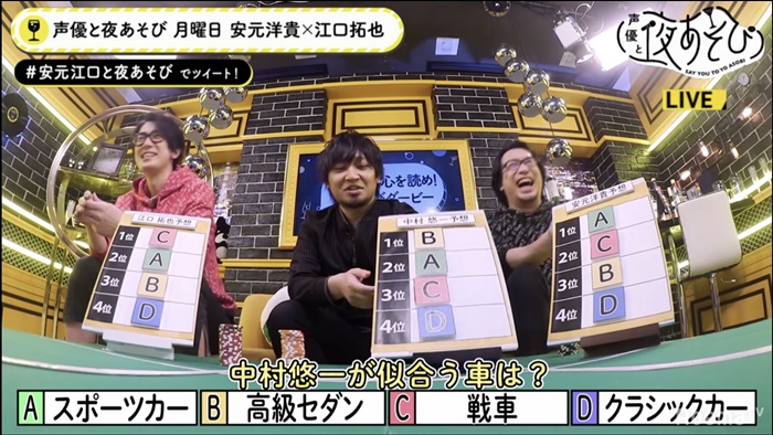 ■アニメ LIVE チャンネル/『声優と夜あそび【月:安元洋貴×江口拓也】#31 中村悠一がゲストに登場!』