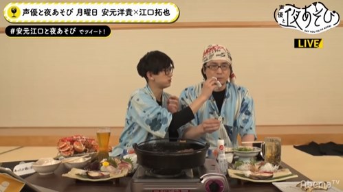 安元洋貴×江口拓也『声優と夜あそび』温泉ロケと豪華グルメでイチャイチャ! 江口「カニついてるよ……」に安元マジ赤面!?