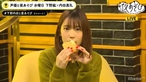 “アニメ LIVE チャンネル”において、11月27日の夜10時から夜11時30分にわたり、『声優と夜あそび【水:下野 紘×内田真礼】#33 石原夏織がゲストに登場!』が放送されました。“食欲の秋まんぷくウィーク”の3日目となる本放送では、“悪魔的チーズフォンデュはコレだ!”と題して MCの2人でチーズフォンデュを楽しんだほか、クリスマスの仮装について考える“クリスマスコスプレミーティング”、水曜の人気コーナー“ダ ミヘで癒しボイス、囁きます”などが行われました。