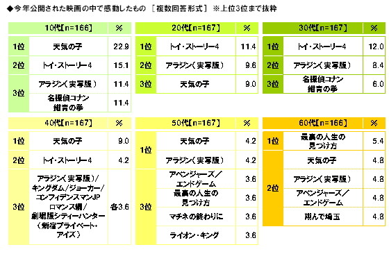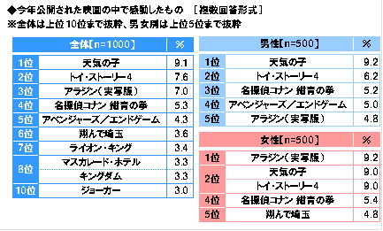全回答者(1,000名)に、今年公開された映画の中で感動したものを聞いたところ、1位『天気の子』(9.1%)、2位『トイ・ストーリー4』(7.6%)、3位『アラジン(実写版)』(7.0%)、4位『名探偵コナン 紺青の拳』(5.3%)、5位『アベンジャーズ/エンドゲーム』(4.3%)となった。『君の名は。』で一世を風靡した新海 誠監督の最新作が1位となった。