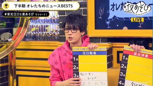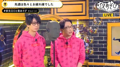 12月16日の夜10時から夜11時30分にわたり、『声優と夜あそび【月:安元洋貴×江口拓也】 #36』が放送されました。本放送では MC の安元洋貴さんと江口拓也さんがお揃いのパーカー姿で登場し、12月13日に行なわれた「夜あそびヒーローショー」について安元さんが語ったり、ふたりの近況を話す「2019 年下半期オレたちのニュース BEST5」や、定番コーナーの「世界のことわざあるなしクイズ」、「味深ワード」などを行いました。