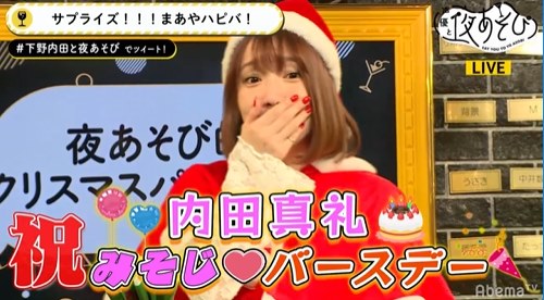 実は、本放送のメイン企画は12月27日(金)に30歳の誕生日を迎える内田さんのサプライズバースデーパーティー。予想外の出来事に、内田さんは「えええ~~、ウソでしょ~!?もう、ちょっと、バカ~~!」驚きつつも、嬉しそうな笑顔を見せました。