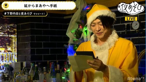 “夜あそび的クリスマスパーティー!”と題したコーナーでは、なぜかメインになりがちな“プレゼント交換”からスタート。音楽が鳴っている間、出演者とスタッフが選んだクリスマスプレゼントを順に回していきます。しかし、途中でプレゼントを内田さんの目の前に積み始める下野さんと清野さんとスタッフ一同。