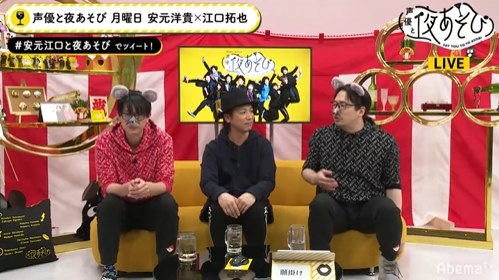“無料で楽しめるインターネットテレビ局”『AbemaTV(アベマティーヴィー)』は、『アニメLIVEチャンネル』において、2020年1月6日(月)の夜10時から夜11時30分にわたり、『声優と夜あそび【月:安元洋貴×江口拓也】 #38 鳥海浩輔がゲストに登場!』を放送いたしました。