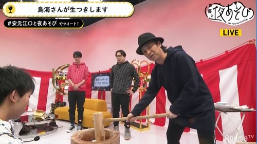 本放送では、鳥海浩輔さんをゲストに迎えて新年初の“夜あそび”を行ないました。紅白の幕が張られた広めのスタジオでは、「新春イッパーツ!ついて ついて つきまくれぇ~!」と題して3人で餅つきをするコーナーを実施。杵を手に、今年の願いを叫びながら餅を5回突きます。安元さんは「斉藤壮馬、斉藤壮馬……蒼井翔太~~!」とゲストに来てほしい声優の名を叫びながら豪快に杵を振るいます。