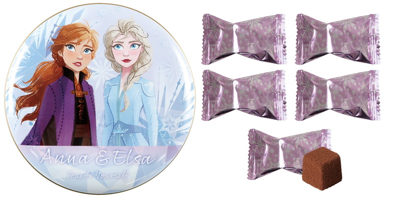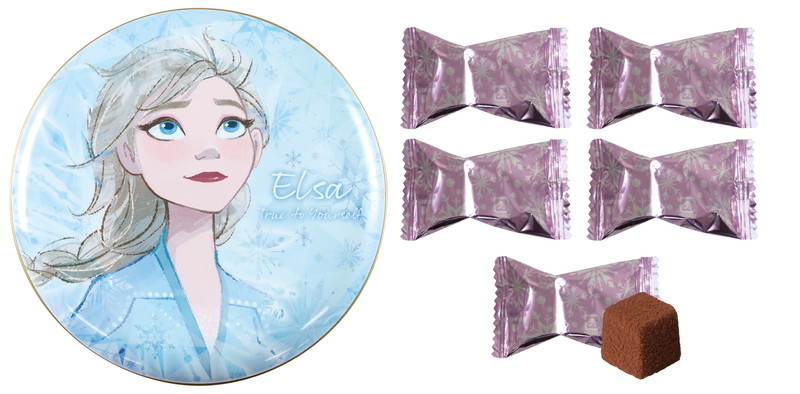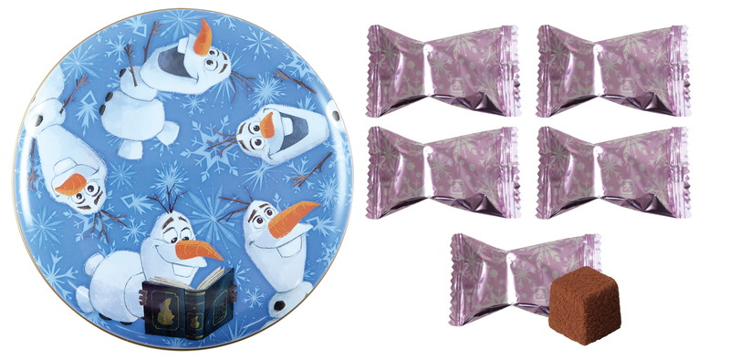 エルサ、エルサとアナ、オラフの3種類のデザイン缶。中にはソフトチョコレートが入っている。