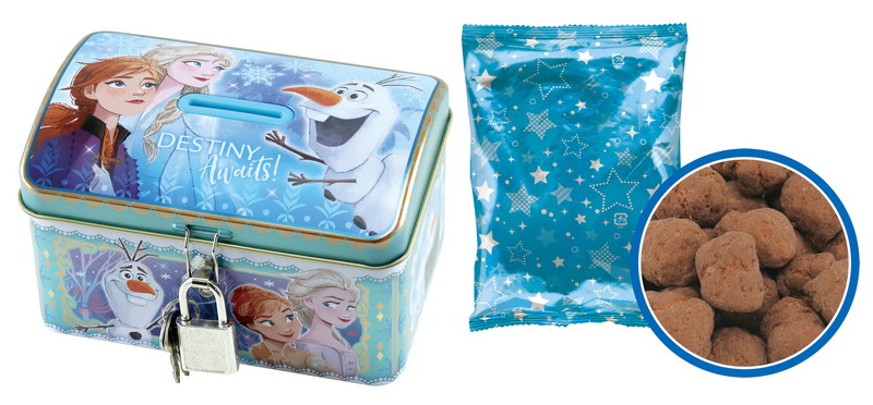 アナ、エルサ、オラフデザインの鍵付き缶の中に、パフチョコレートが入っている。食べ終えた後には、貯金箱としても使用できる。