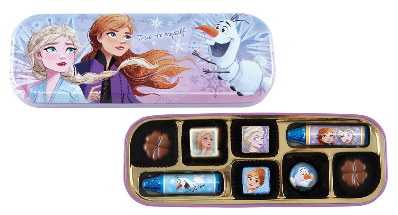 食べ終えた後にペンケースとして使用できるペン型の缶の中に、アナ、エルサ、オラフデザインのチョコが入っている。