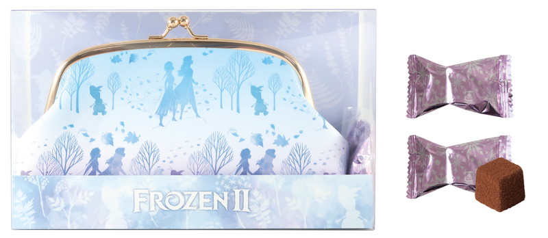 アナ、エルサ、オラフのシルエットデザインのポーチの中に、ソフトチョコレートが入っている。食べ終えた後には、そのままポーチとして使用できる。