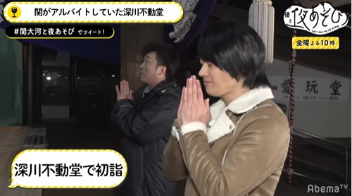 まず2人は有名な深川不動堂に向かいます。成田山新勝寺の東京別院である深川不動堂は、お正月になると大勢の人で賑わう場所。関さんは「ここで結んだお神籤を外すアルバイトしていたんだよ」、「参拝客に靴を入れるビニールを配ったこともあった」と思い出話を披露しながら境内の奥で初詣をすることに。お賽銭を入れて手を合わせた関さんは「のうまく・さんまんだ・ばさらだん……」と掲示されていた不動明王の真言を唱え「こういう羅列された平仮名をすらすら読めるのは、声優ならではだよね」と笑いました。
