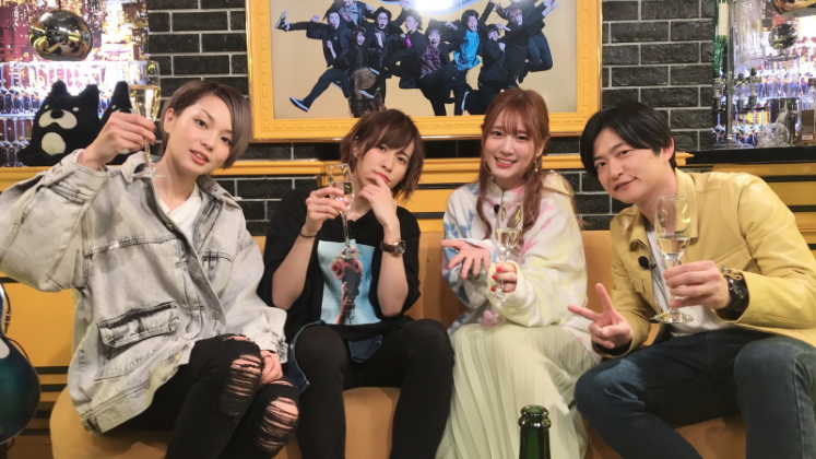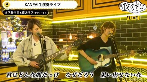 放送内では、「KANPAI生ライブで乾杯!」と題して、飯田さんと村井さんによる生ライブも行ないました。約2か月前にギターの練習を始めた 2 人は「KANPAI」というユニットを組んでおり、カメラの前でじんさんの『サマータイムレコード』のカバーソングを歌います。「KANPAI」としては初の生ライブに緊張しつつも全力のパフォーマンスを披露し、下野さんと内田さんの「すごくよかった!」「こんな特等席で楽しませてもらっちゃった!」という言葉と大きな拍手に、達成感に満ちた笑顔を浮かべました。