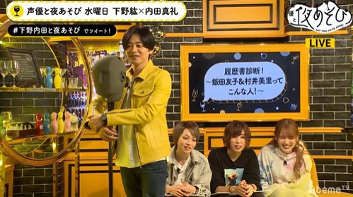 ■『アニメ LIVE チャンネル』/『声優と夜あそび【水:下野紘×内田真礼】#44 飯田友子・村井美里ゲスト