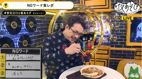 本放送では月曜日の恒例コーナーとなった「NG ワード食レポ」を実施。片方が食レポ担当となり、片方が秘密で設定した“NG ワード”を言わないようにレポートを行なう、というルールです。